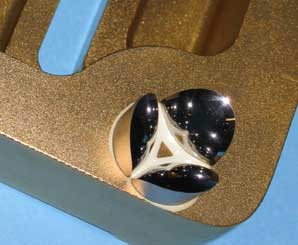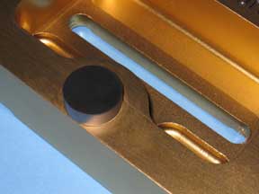 The kinematic coupling that holds the first support sphere consists of three precision spheres located in a circle and rigidly mounted to the aluminum structure. The other coupling consists of two precision lapped cylinders rigidly mounted to the aluminum structure, to form a Vee-Block, that locates the second support sphere. There is a powerful rare earth magnet just below each of the couplings that pulls the support spheres solidly down against the kinematic couplings.